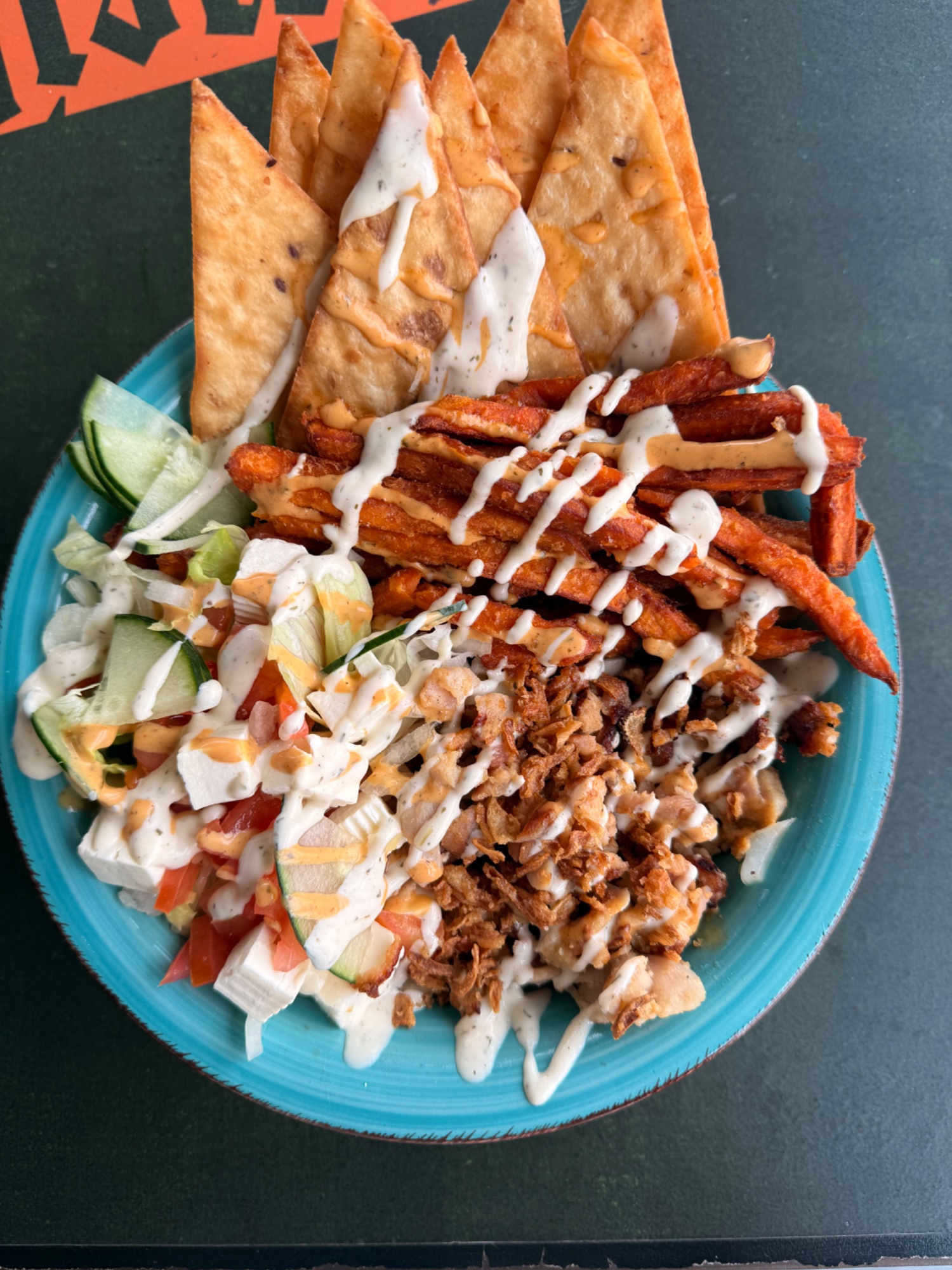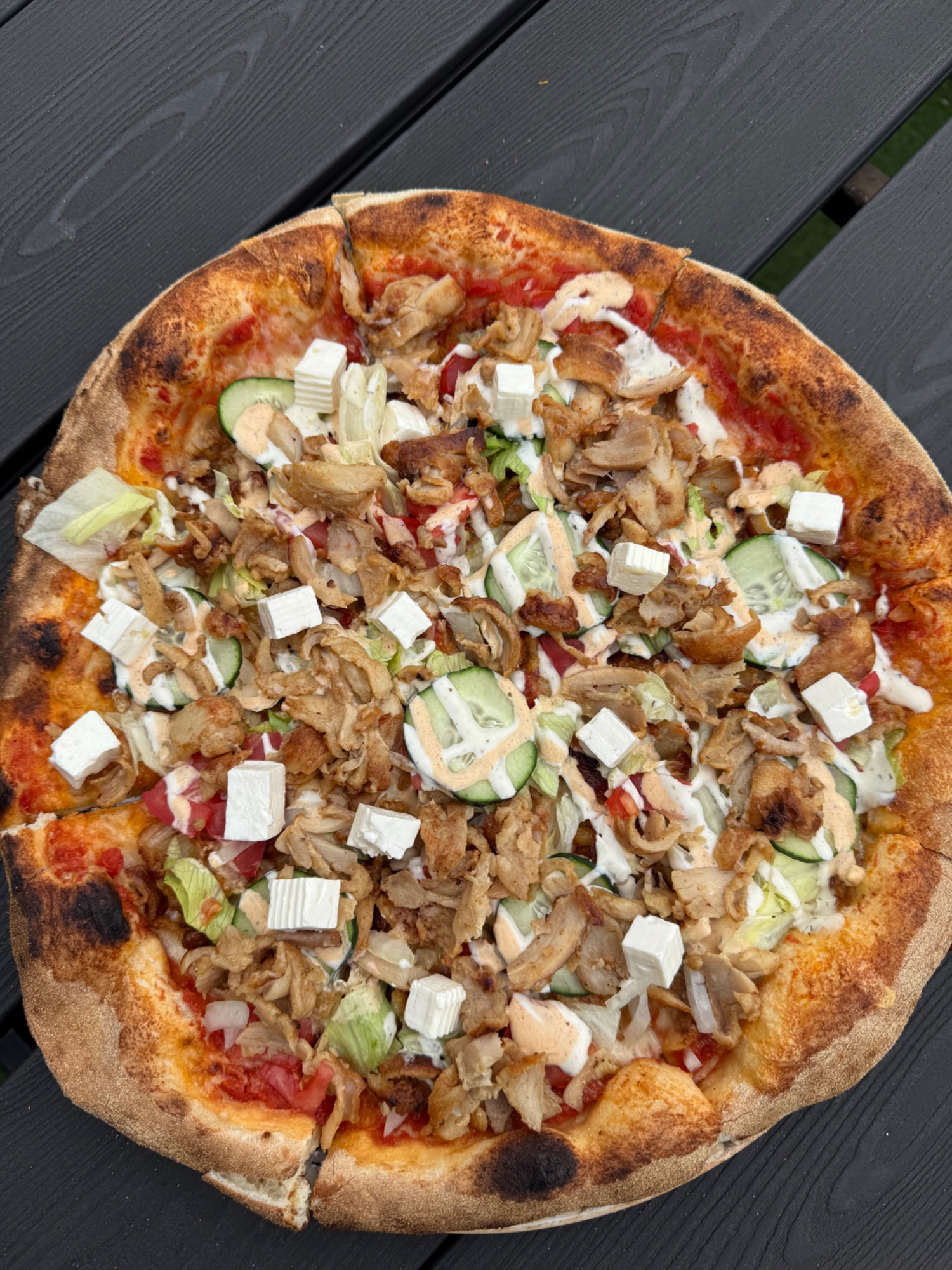 pileći kebab u lepinji, iceberg salata, luk, svježi krastavac, rajčica, feta sir, umak -