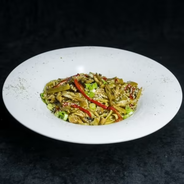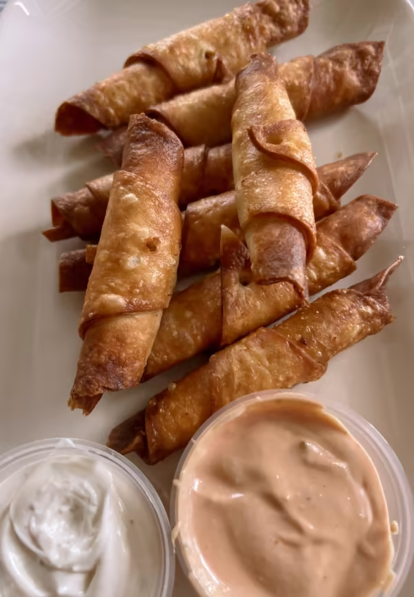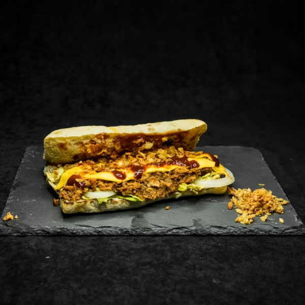 Tortilla, pulled pork, jalapeno cheese sauce, BBQ umak, prženi luk -
