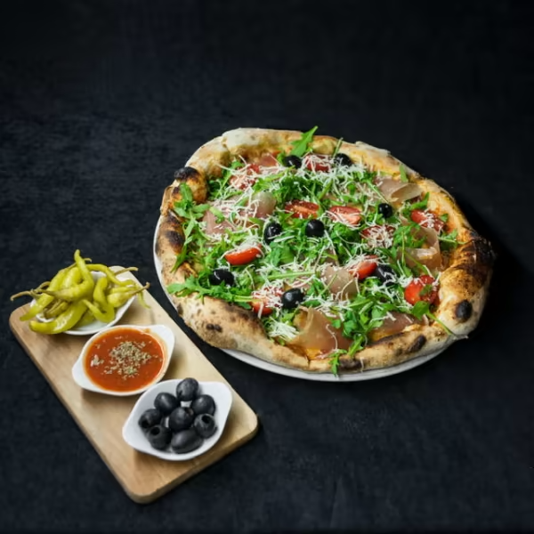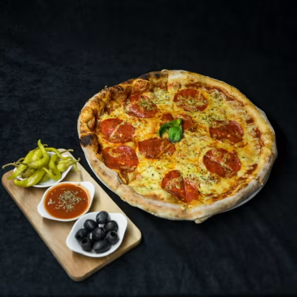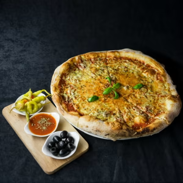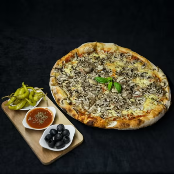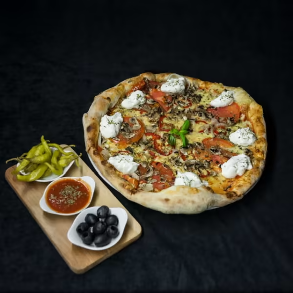 Rajčica, sir, paprika, gljive, luk, origano, maslina