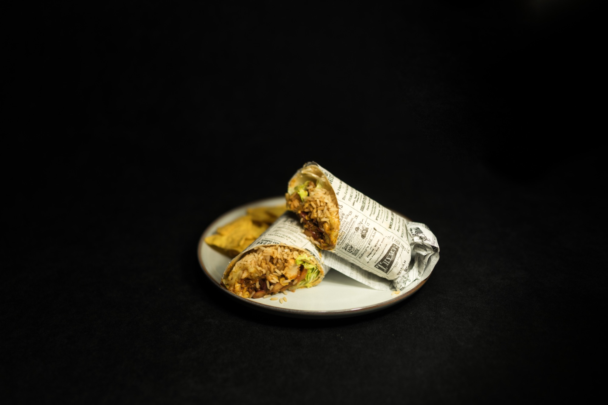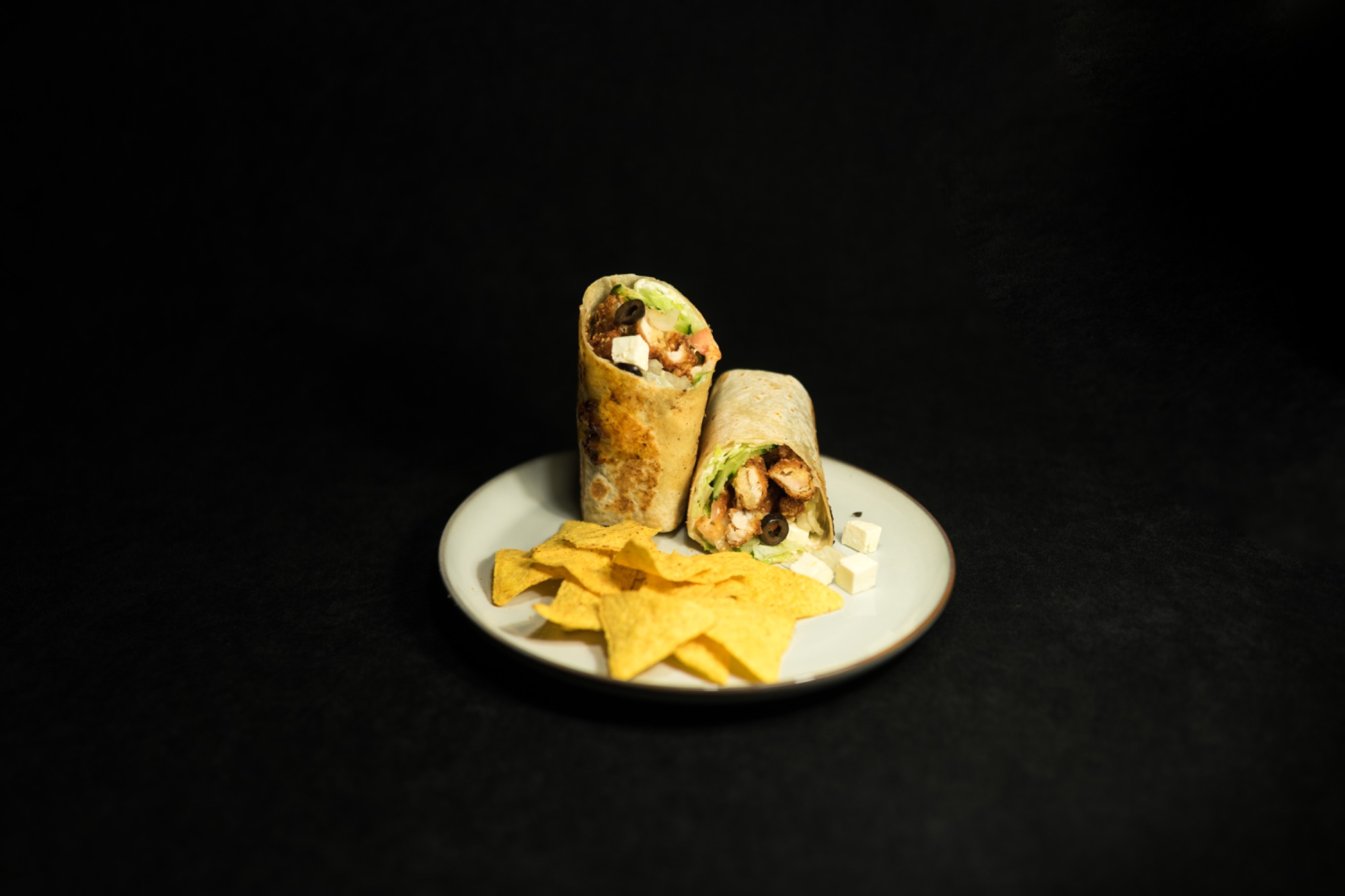 pileći kebab u tortilji, iceberg salata, luk, svježi krastavac, rajčica, feta sir, umak -